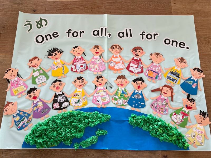うめ クラスページ 2025.06.052024.09.28 うめ 年中組:『My favorites(私のお気に入り)』IB 年中組に進級し、これまで様々な活動に共通しているテーマが、『自分の素敵なところを知ってもらおう』です。お見知り遠足の“好きなものビンゴ”、運動会の“リズム表現”…。 今回は、『My favorites(私のお気に入り)』を題材に、自分の似顔絵と好きなものを組み合わせた、『自分』を作りました。それぞれのクラスの制作物にあるメッセージ さくら組:『Together we better. ~一緒にいると楽しい、お互い支えあって成長しよう~』 うめ組:『One for all. All for one. ~一人はみんなのために みんなは一人のために~』 は、今年度1年を通じて、こどもたちと共に取り組むテーマです。今回の運動会での学びがきっと翌日の活動へとつながる事でしょう。 今回の制作活動のねらいは以下の通りです。●出来上がりをイメージしながら、最後まで丁寧につくる●自分の顔を鏡でじっくり見ながら、顔のパーツの形や色を丁寧に描く また、今回の制作では、以下の内容にも配慮しました。★切る…髪の毛を1本1本丁寧に切りました。画用紙の色や、髪の毛の大きさにもそれぞれの配慮が見られます。★(のりで)貼る…貼りたい場所に分量を考えて丁寧に貼っていきました。『はみ出さないように』『はがれてこないように』がポイントです。★(自画像・好きな物)描く…『顔』を描く時は、『表情』が大切。鏡を見ながら、様々な表情を見せてくれました。一番多かったのが“笑顔”でした。 本日の運動会もはじける笑顔で頑張ります! かけっこ ≪撮影ポイント:1F年中組園児席(カーブやコース取りの走り方をご覧ください。)≫ 1学期より始まった『Sports Day』は、週に一度、運動活動専門の教師と取り組む活動です。 この活動では、“遊び”を通した運動能力の発達を意識しています。定期的にこどもたちそれぞれの運動スキルの育ちを数値化、分析し、次の運動遊びに反映させていきます。さらに、幼稚園職員の雑賀先生と取り組む『運動の日』でも、4歳児ならではの様相から、こどもたち一人ひとりが持っている体力や気力、経験値を意識し、専門的な観点からさらに“運動する楽しさ”を感じられるように取り組んでいるところです。 今回のかけっこでは、前年度取り組んだ内容を思い起こしつつ、新たに『体の軸』や『重心』を意識した以下の点について取り組んできました。 ・腕の振り方、足の上げ方(速く走るためには?) ・どこを見ながら走るとよいか(視線) ・体の軸、重心ってなに?(カーブをスピードを落とさず走るためには) こどもたち一人ひとりが、一生懸命取り組む姿にご期待ください。 なお、本日一緒に走るグループは、25メートル走のタイムを測定し、タイム差のないこどもたち同士で構成しています。取り組むたびに“ライバル意識の芽生え”を感じさせるような真剣な表情にもご注目ください。 リズム表現虹のむこうに ~夢をバルーンにのせて~ ≪撮影ポイント:2F年中組保護者観覧席(こどもたち全員の素敵な笑顔が見られます)≫ こどもたちに大人気の歌『虹の向こうに』。この曲はNHK「おかあさんといっしょ」で1996年4月から歌われ始め、現在まで様々なアーティストに歌い継がれている曲です。 軽快なテンポと、虹の向こうに広がる可能性や希望、夢を表す歌詞は、聴いている人の心に明るい未来を想像させます。 今回年中組では、この曲をテーマに以下の内容を取り組んできました・歌詞に込められた意味を体の動きで表現する・自分の体のどの部分を意識して動かすと良いかを考えながら、一つ一つの動作について考える・パラバルーンを通して友だちと協力し、“一体感”を味わいながら取り組む充実感を味わう 自分の役割を意識し、一生懸命取り組んできました。こどもたちの掛け声にもその気持ちが感じられます。バルーンの形にもご注目ください。🌍今回の取り組みは、IBの視点で活動しています。ポートフォリオも併せてご覧ください。 取り組みの様子をご覧ください かけっこ 制作 リズム表現